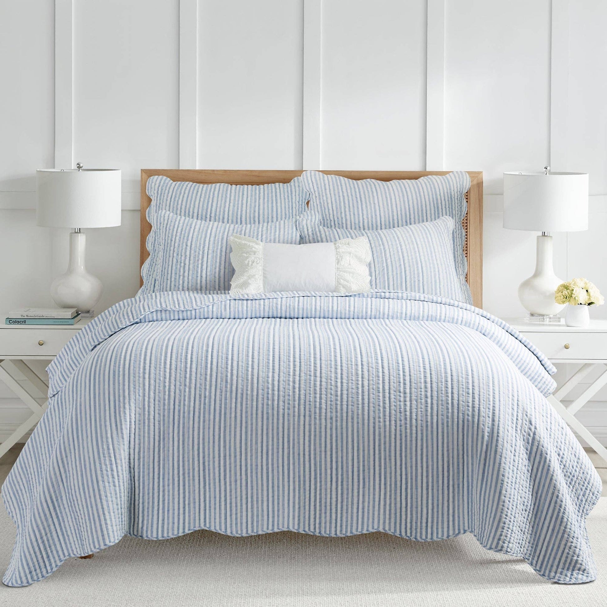 The Martha Stripe Reversible Quilt Set is inspired by charming farmhouse aesthetics. Soft, elegant and timeless. Offered in blue and white, this design will immediately transform your bedroom. This reversible quilt features soft blue and white stripe with scalloped edges on the front, reversing to a same pattern on the back. The Quilt set has a cotton front and back, filled with a cotton-rich filler, and are machine washable. Enjoy this for years to come! This item is sold as a set. Full/Queen: Quilt (88x92) and 2 Standard Shams (20x26)
