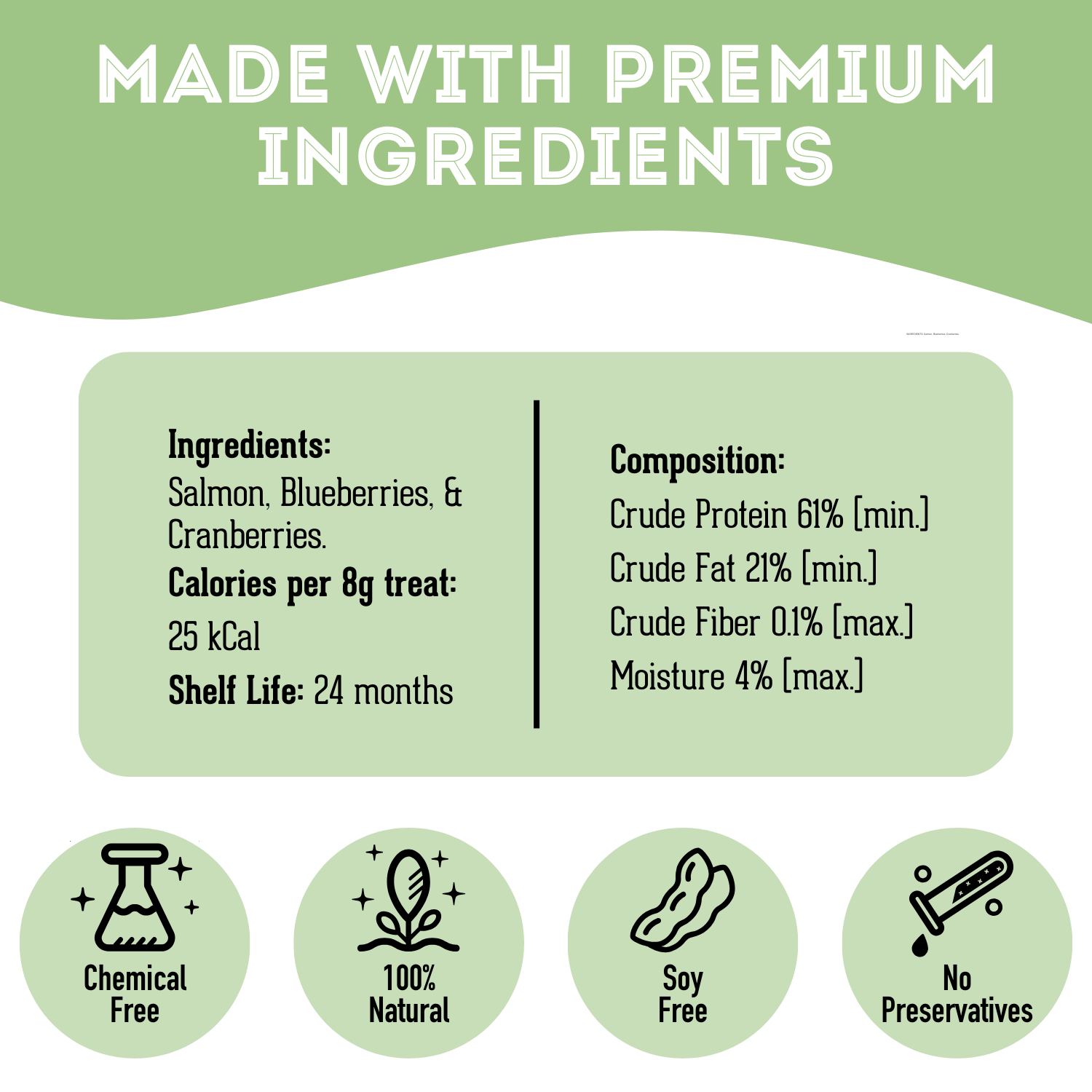 Our seafood comes from Federally inspected facilities. We only use single or limited ingredients in our dried treats. They are either 100% Fish or 100% Meat.