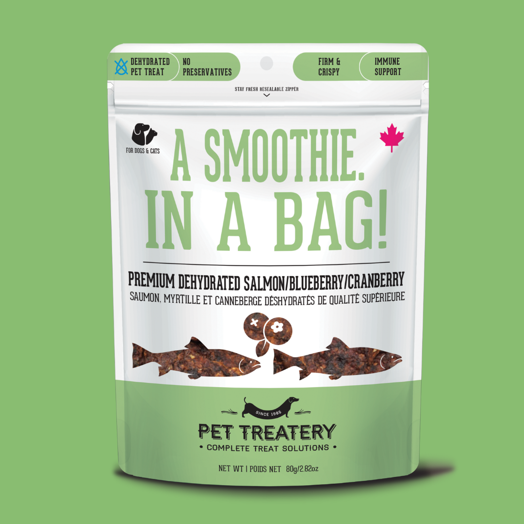 Wild Salmon, cranberries and blueberries make an irresistible treat for cats and dogs. At the Granville Island Pet Treatery, we only use wild-caught salmon which has been documented to be vastly more healthy than farmed salmon. Wild salmon has three times less saturated fat than farm-raised salmon and has fewer calories. Cranberries and blueberries are great low-calorie treats for dogs. They also contain antioxidants, fiber and vitamins C and K. These nutrients support the immune system and contribute to overall health. Adding cranberries and blueberries to your dog’s diet is a great way to help keep him happy and healthy.